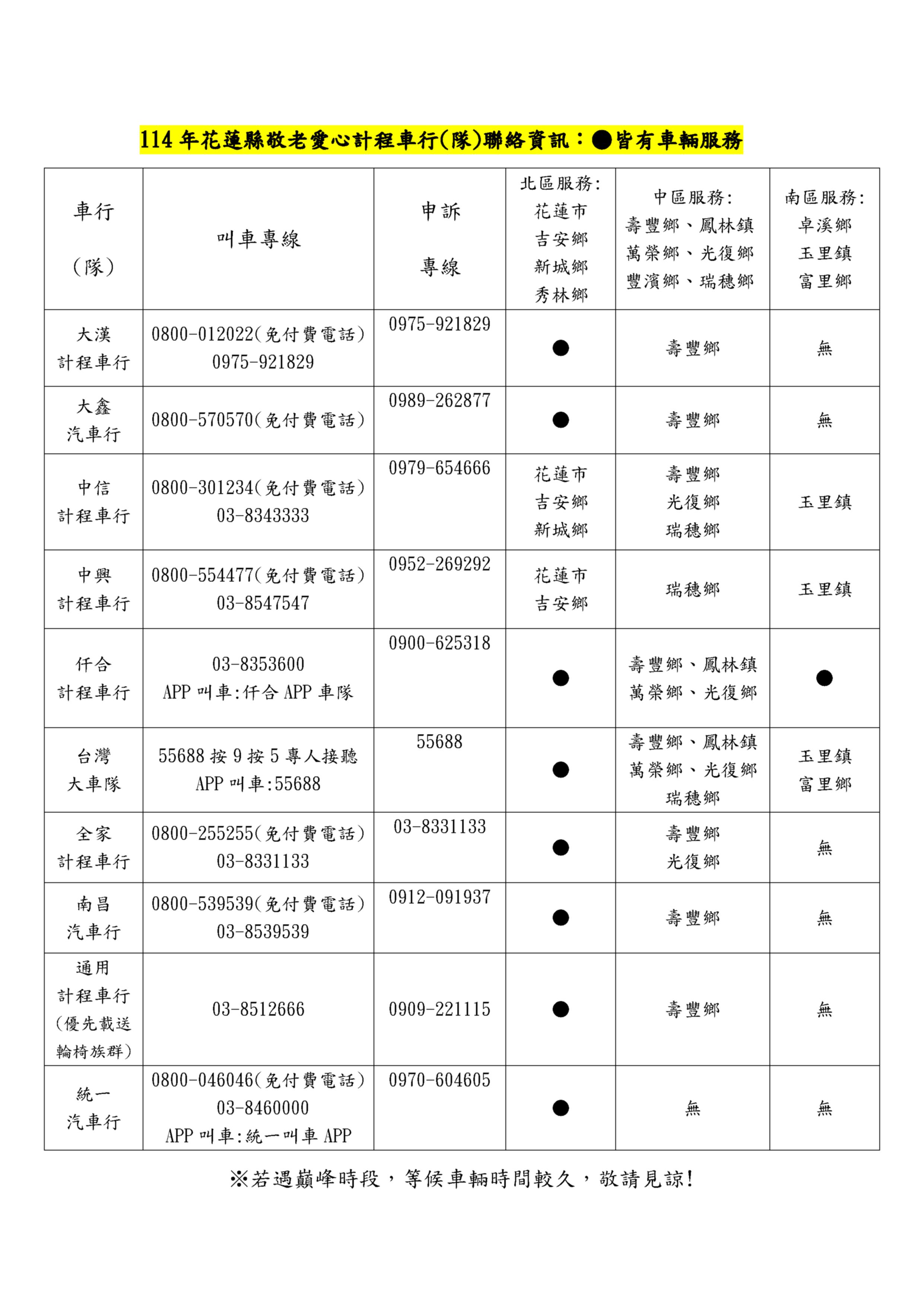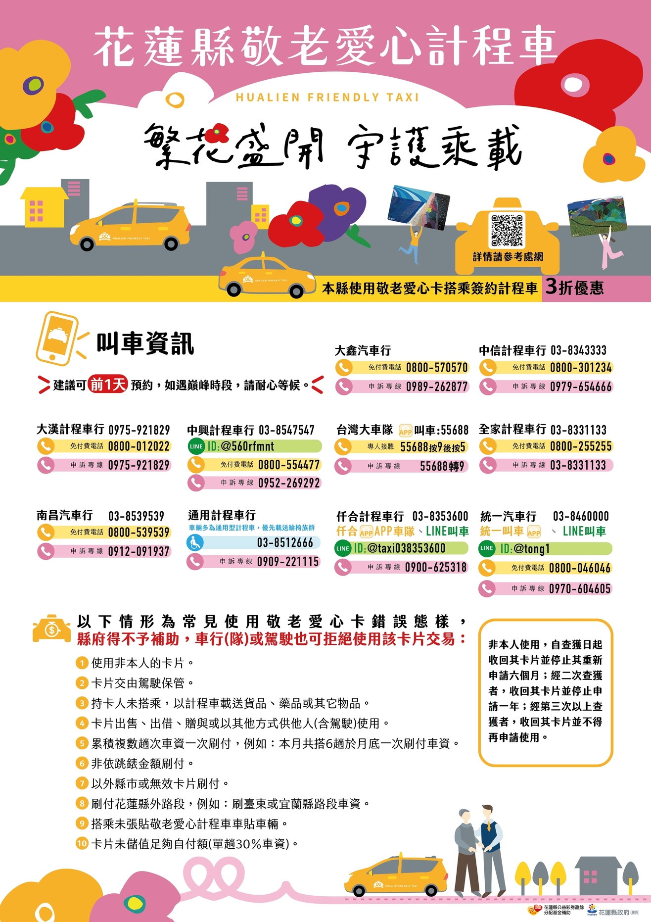 | 計程車 | 1.搭乘與本府合作之敬老愛心計程車,每趟由本府補助70%,民眾自行負擔另30%車資,每月至多補助1,000元。 2.本府已於本縣愛心卡內設定1,000點(1點=1元),持該卡搭乘敬老愛心計程車(貼有辨識貼紙之車輛),下車時直接刷愛心卡付費,即享車資3折優惠。 (意即70%的車資由本府設定的點數扣除,另30%車資由民眾儲值款扣除) ※搭乘愛心計程車時請務必攜帶本縣愛心卡,否則將不予補助※ 3.點數每月重新計算,未用完之點數不累計。【叫車資訊】(叫車時請敘明持有愛心卡、一天前可先電話預約) ◆ 大漢計程車行 :0800012022(免付費電話)、0975-921829 (申訴專線:0975-921829) ◆ 大鑫汽車行:0800-570570(免付費電話)(申訴專線:0989-262877) ◆ 中信計程車行:0800-301234(免付費電話)、03-8343333(申訴專線: 0979-654666) ◆ 中興計程車行:0800-554477(免付費電話)、03-8547547、LINE叫車 ID:@560rfmnt(申訴專線: 0952-269292) ◆ 仟合計程車行:03-8353600、仟合APP車隊、LINE叫車 ID:@taxi038353600(申訴專線:0900-625318) ◆ 台灣大車隊 :55688按9再按5、55688APP叫車 (申訴專線:55688轉9) ◆ 全家計程車行:0800-255255(免付費電話)、03-8331133(申訴專線: 03-8331133) ◆ 南昌汽車行:0800-539539(免付費電話)、03-8539539(申訴專線: 0912-091937) ◆ 通用計程車行(車輛多為通用型計程車,優先載送輪椅族群) :03-8512666 (申訴專線:0909-221115) ◆ 統一汽車行:0800-046046(免付費電話)、03-8460000、統一叫車APP、LINE叫車 ID:@tong1(申訴專線:0970-604605) 4.【點數餘額查詢方式】 ◆ 悠遊卡公司記名卡查詢歷史交易記錄網站(https://ezweb.easycard.com.tw/search/CardSearch.php) ◆ 電洽悠遊卡公司(02-4128880),提供卡號即能查詢。 5.【如何申訴】 ◆ 除可利用各車行(隊)申訴專線反映外,亦可提供具體乘車時間、上下車地點、車號、駕駛姓名及敬老愛心卡號等相關訊息,請向以下單位進行申訴。