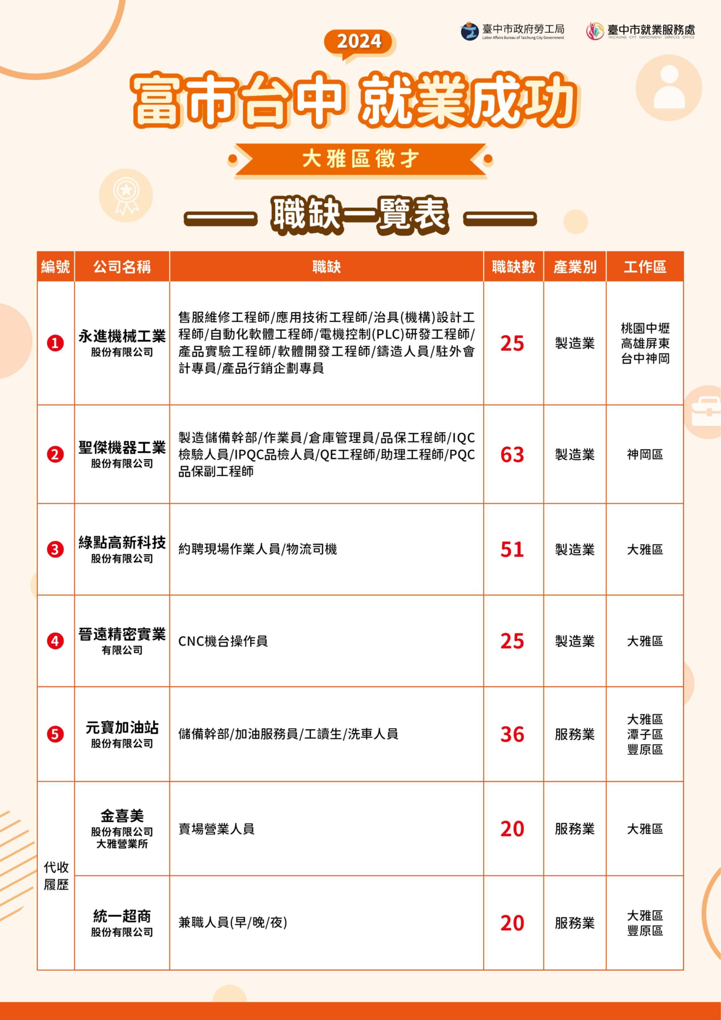 【轉知】臺中市政府2024「富市台中 就業成功」大雅區徵才資訊