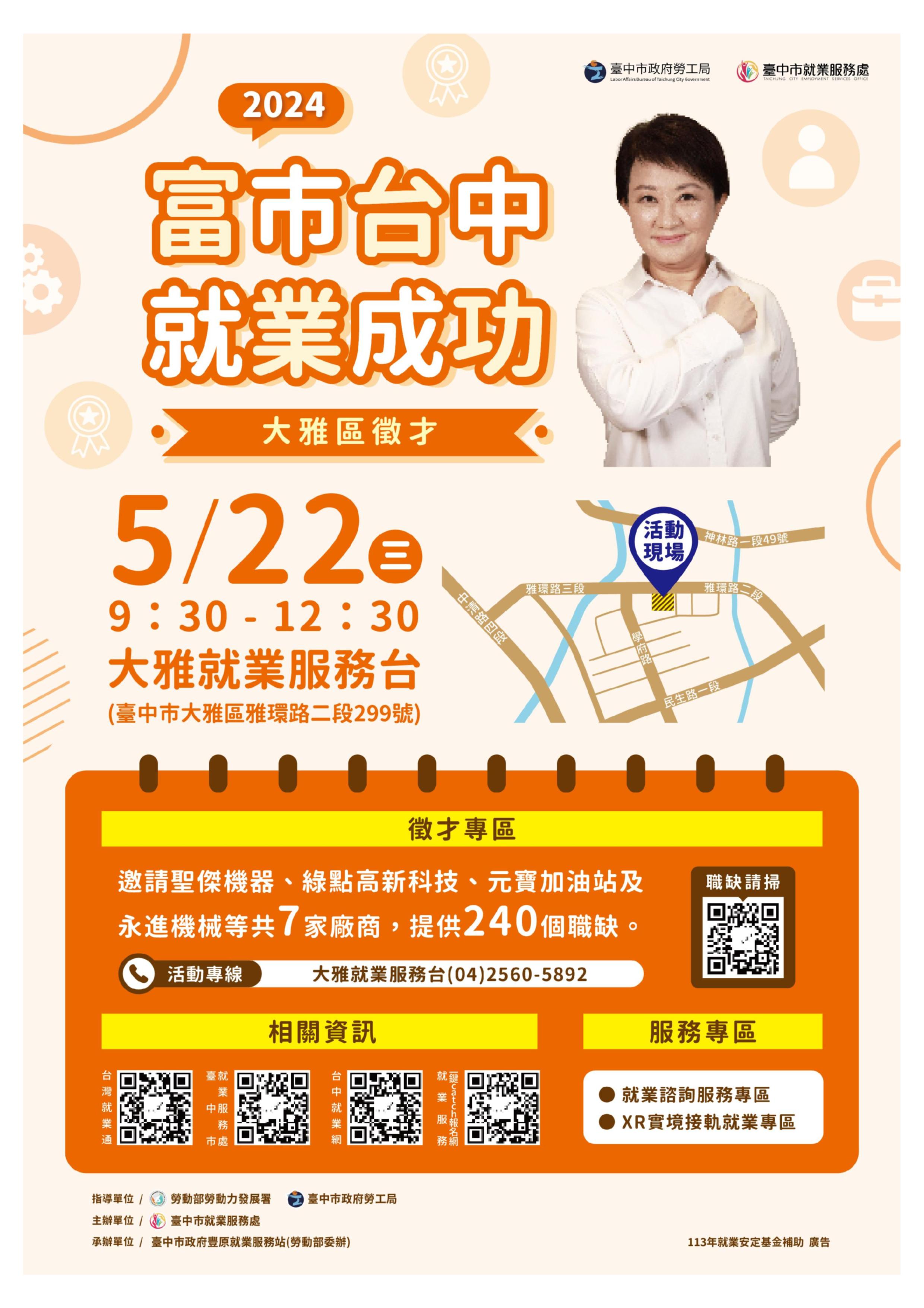 【轉知】臺中市政府5月22日在大雅就業服務台辦理徵才,邀請7家廠商,提供240個職缺,詳情請至臺中市就業服務處官網查詢