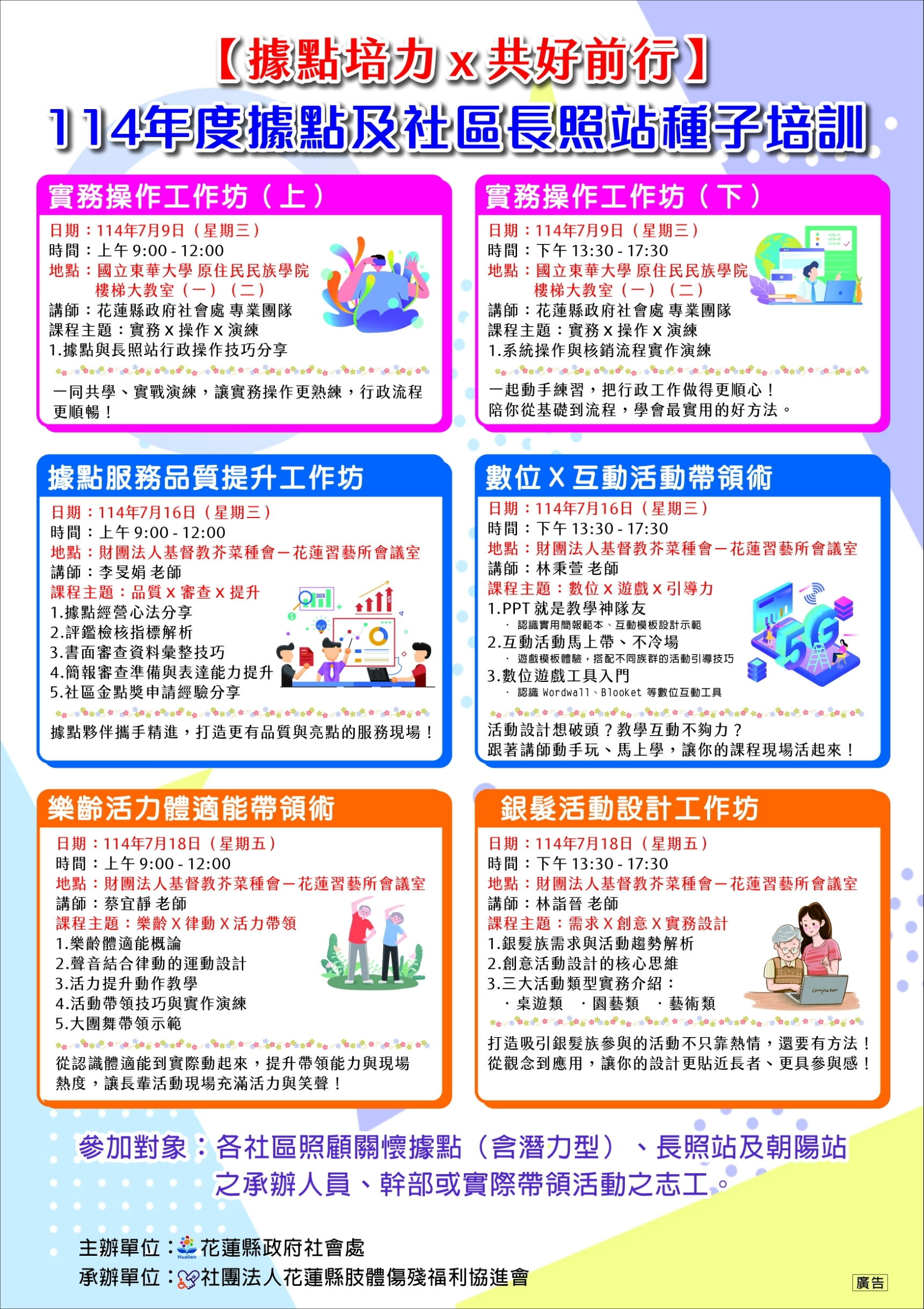 花蓮縣政府辦理【據點培力 X 共好前行】114年度據點及社區長照站種子培訓課程公告