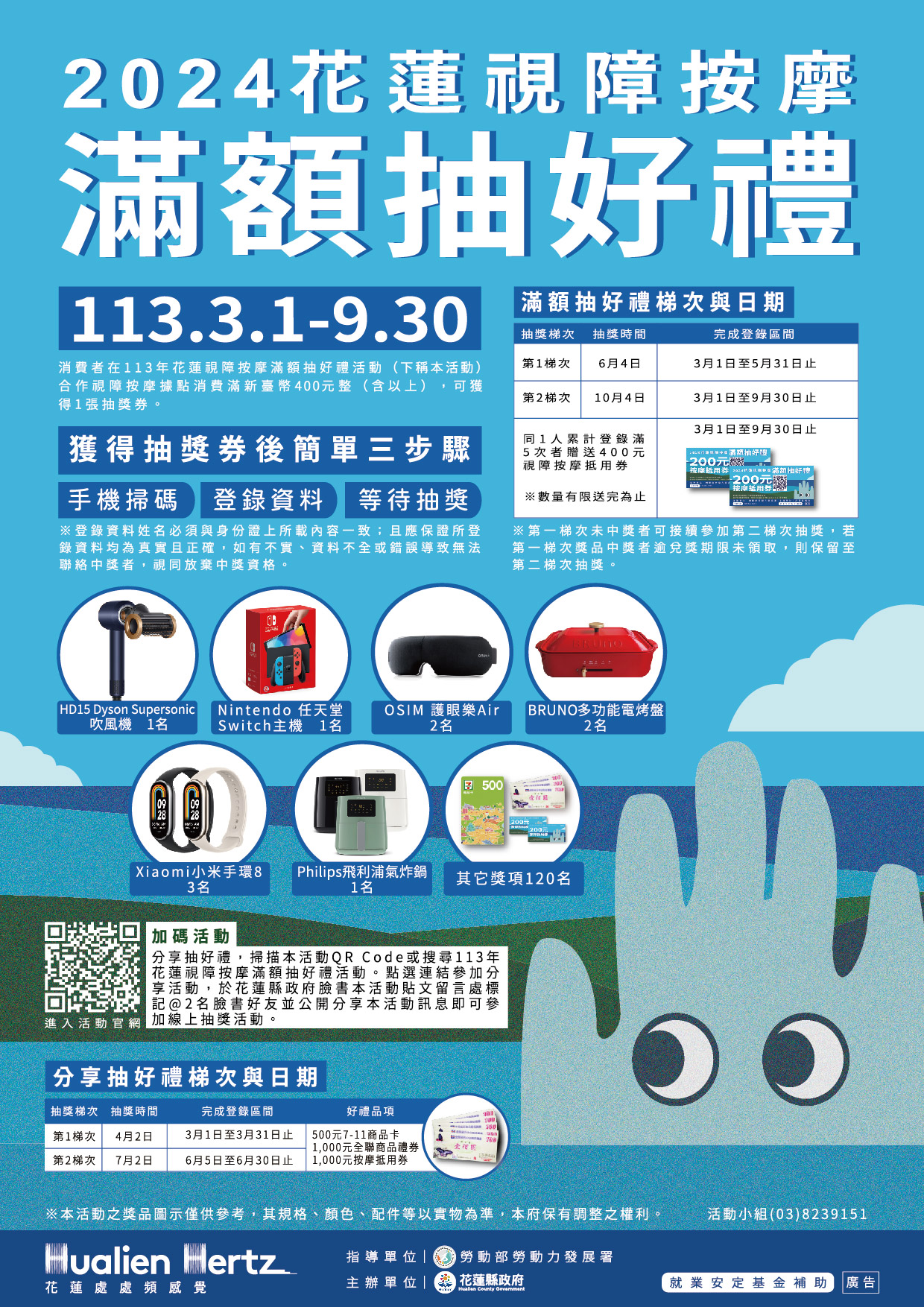1.活動期間內,消費者在113年花蓮視障按摩滿額抽好禮活動(以下稱本活動)合作視障
