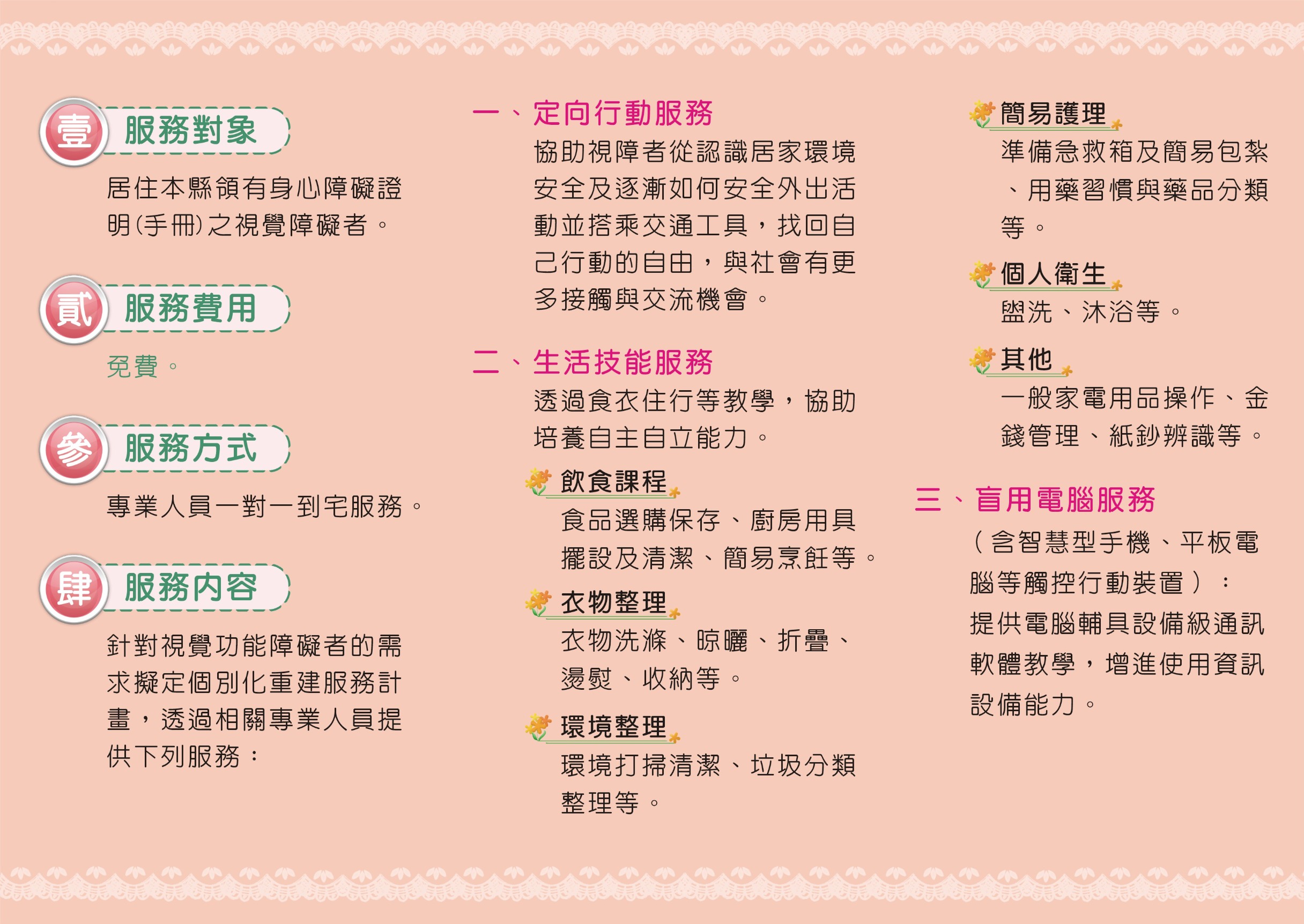 一、服務目的:提供中途致障視覺功能障礙者,由專業人員協助培養自我照顧技能,提升自我照顧能力,建構生活能力並促進社會參與。