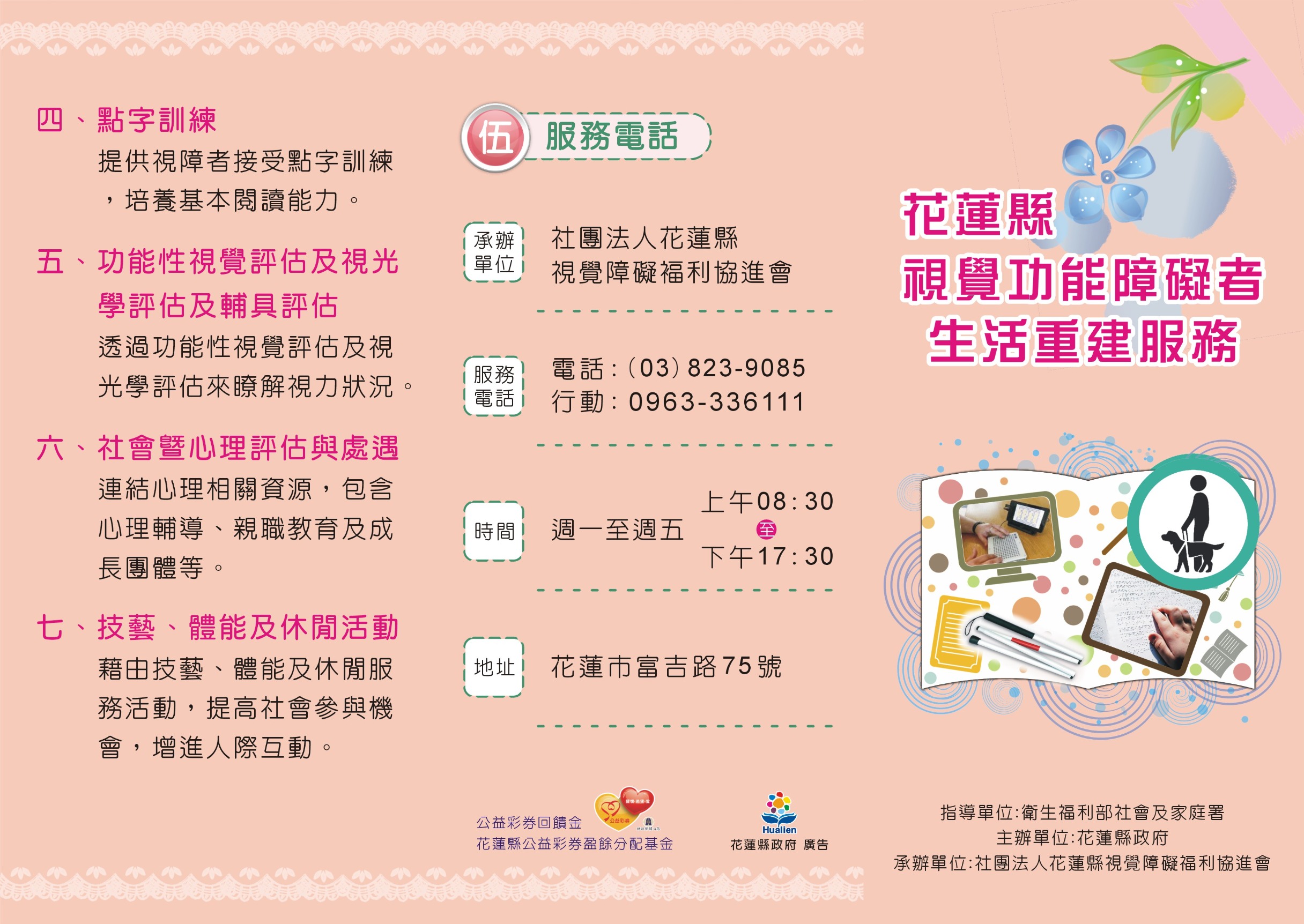 五、申請方式:本府委託社團法人花蓮縣視覺礙福利協進會辦理,電話:(03)8239085。地址:花蓮市富吉75號。電子郵件wish8239085@gmail.com。