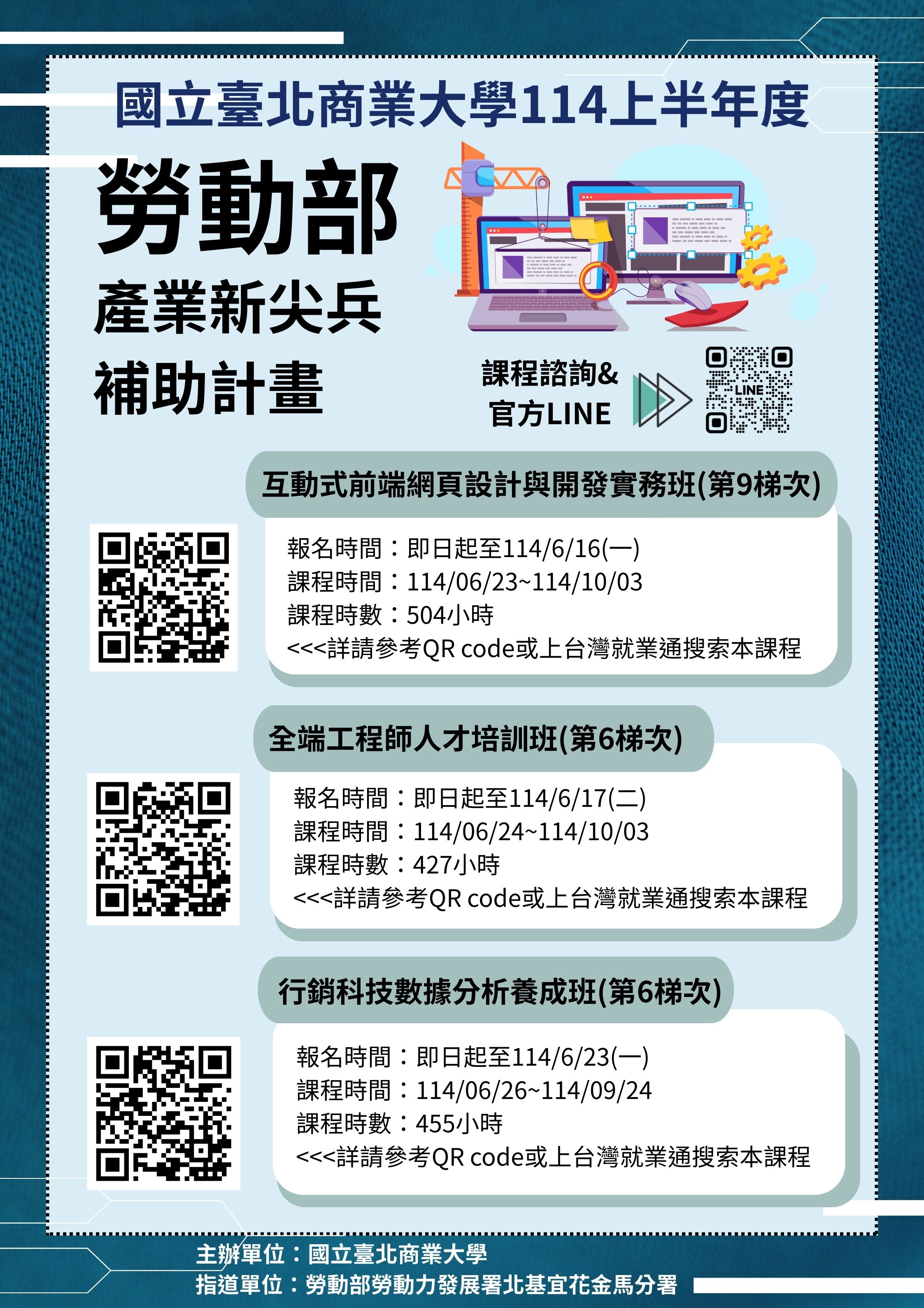 轉知國立臺北商業大學承辦勞動部「產業新尖兵計畫」,辦理「互動式前端網頁設計與開發實務班」、「全端工程師人才培訓班」和「行銷科技數據分析養成班」課程