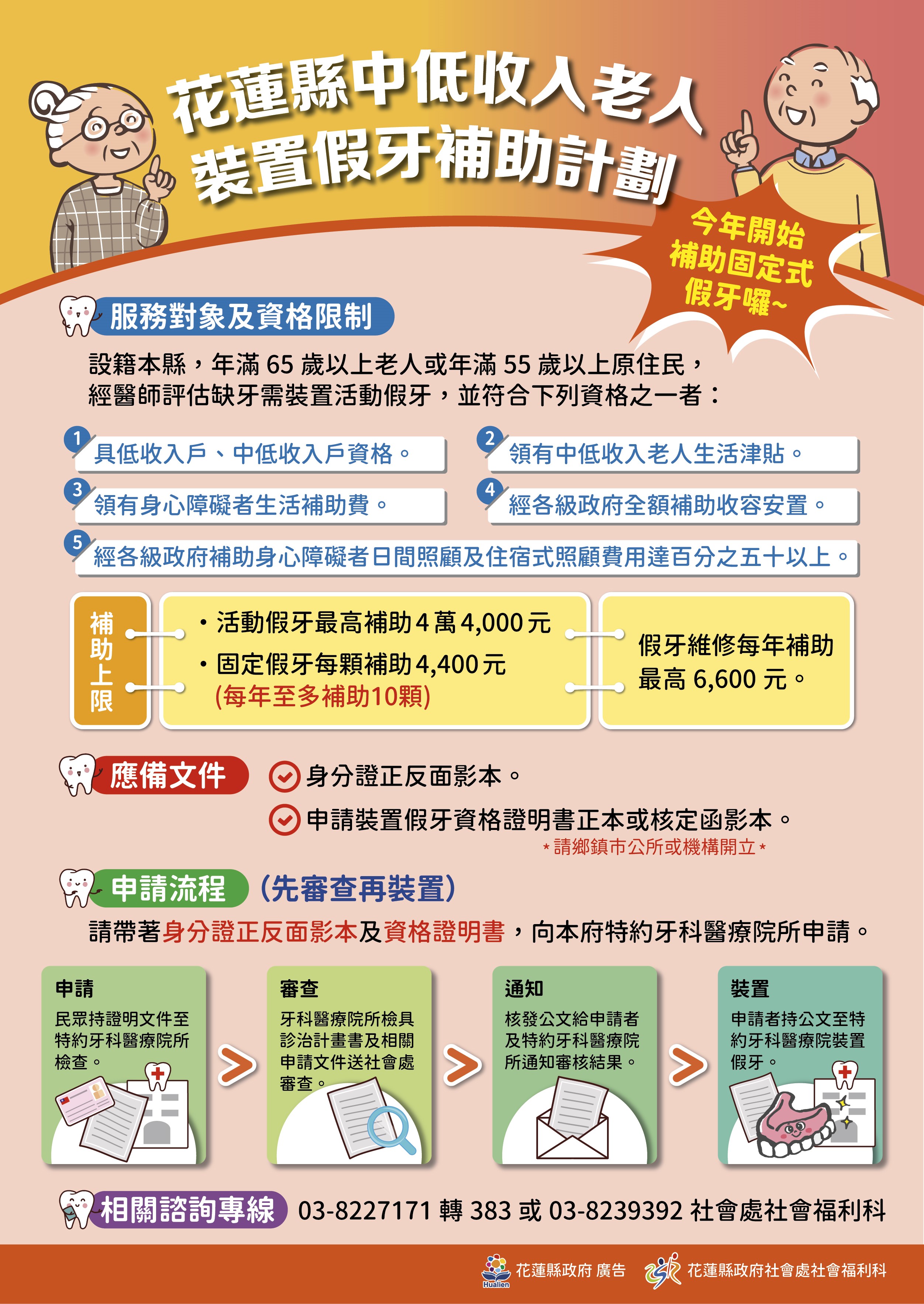 年滿65歲以上老人或55歲以上原住民,設籍本縣,經醫師評估缺牙需裝置活動假牙,並符合下列條件之一者: