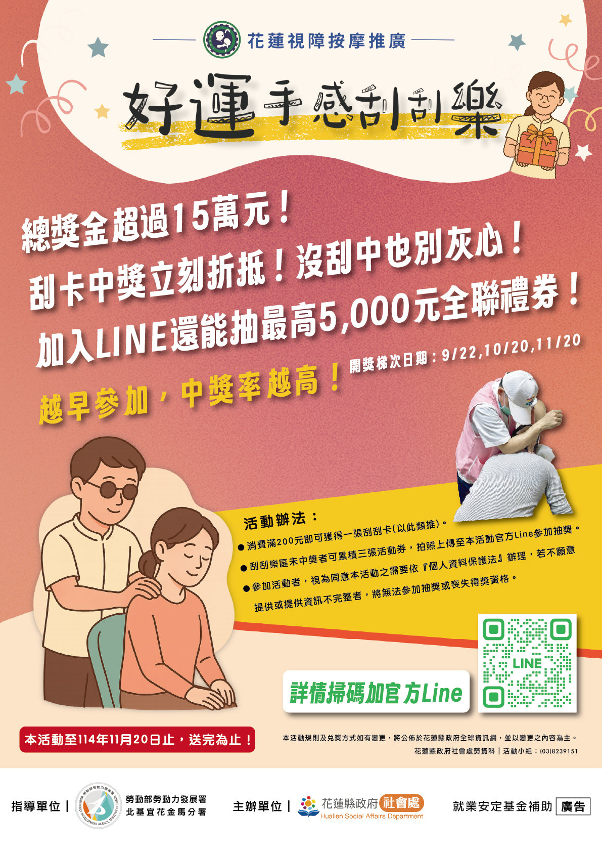 - 活動期間,至花蓮縣各視障按摩據點消費滿 200元,即可獲得 1張刮刮卡(400元2張,以此類推)。
