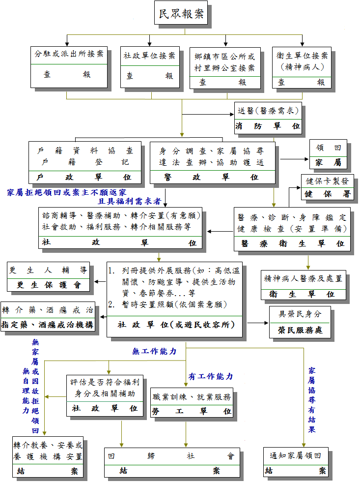 (二)經瞭解倘若個案本人有安置意願或其他社會福利需求(醫療補助、就業自立、社會救助或其他福利服務等),則由警政單位人員填報「遊民案件通報單」通知本府社會處,以利後續提供相關服務。(社會處救助科聯繫電話:8225178,傳真:8227405)