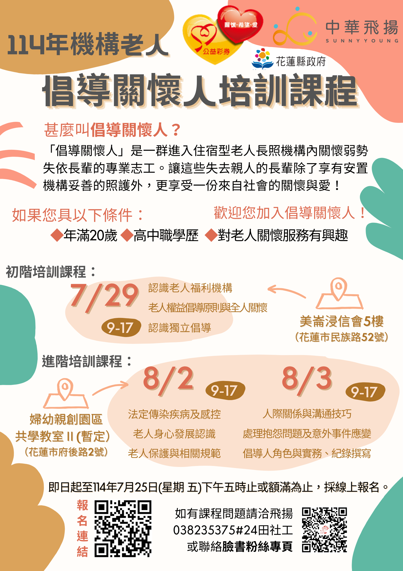 為推動本縣機構老人關懷服務,招募具服務熱忱之志工參與倡導關懷工作,花蓮縣政府辦理「114年機構老人倡導關懷人培訓課程」,歡迎對長者照顧與陪伴有興趣的民眾踴躍報名參加!